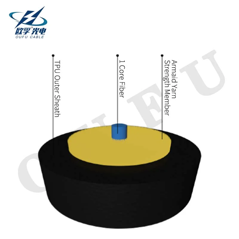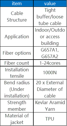 This cable is made by evenly applying strands of Aramid yarns as the strength member over 900μm tight buffer fibers and then is completed with sheath.
